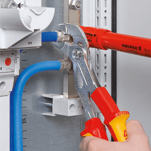 The Knipex Cobra clamps onto the component securely by itself thanks to the jaw geometry developed by Knipex. This means the user can put all energy into the desired movement without pressing the pliers handle together – and thus without energy loss: round components can be turned, bolted connections tightened and released.