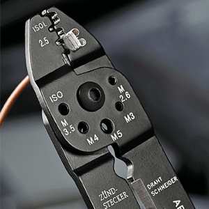 These universal crimping pliers can also be deployed before crimping: e.g. for cutting and stripping cable and wire. The suitably dimensioned openings prevent damage to the strands during wire stripping. A further function is available. As these crimping pliers are manufactured from high strength special steel, threaded pins and screws made of soft material can be accurately cut to length, while the thread is protected.