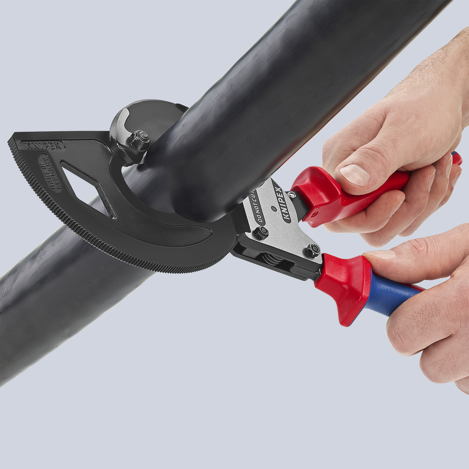 Sturdy. Easy to use. Stable.. Innovative ratchet-drive.. for cable up to Ø 60 mm. Fixed handle with support area for putting down the pliers when cutting. Easy handling due to low weight (825 g) and compact construction (320 mm length) - also usable in confined areas. Cutting through copper and aluminium cables up to Ø 60 mm in one-hand and two-hand operation. Hardened, precision-ground cutting edges cut smoothly and neatly without crushing. For cutting copper and aluminium single conductors as well as multiple stranded cables. Innovative three-stage ratchet-drive with high leverage for easy cutting in one-hand and two-hand operation. Not suitable for steel wire, wire ropes and fine-stranded (highly flexible) conductors.