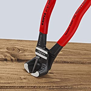 powerful, compact, comfortable. Better handling, greater capacity and lower handforce required compared to conventional bolt end cutting nippers. With cutting edges for soft, hard and piano wire. Particularly high cutting capacity with minimum effort due to optimum transmission ratio. Cutting edges additionally induction-hardened, cutting edge hardness approx. 64 HRC. Forged.