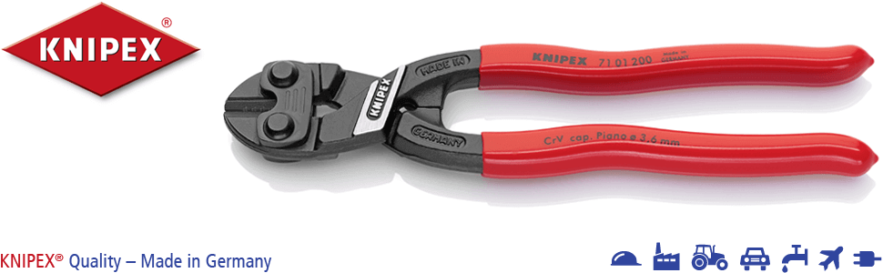 The 71 01 200 CoBolt compact bolt cutters are manufactured in the Knipex factory in Wuppertal-Cronenberg using quality materials. As with the other models of pliers from the Knipex think tank, they stand for top quality and therefore - when used correctly - also for exceptional durability. Their ergonomic shape furthermore means they offer the best possible conditions for gentle and safe use.