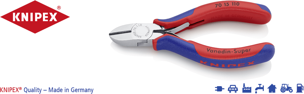 ![]() | The compact diagonal cutters: 110 mm long Optimised for the craftsman’s everyday work Fit in any jacket pocket: the Knipex diagonal cutters in the 110 mm long version are small in terms of dimensions and big in performance. From the shape of the head through to the polish and hardness of the cutting edges, the Knipex 70 15 110 is customised for the diverse cutting tasks in the day-to-day work of electricians, mechatronics engineers and electronics engineers. Universal cutting capacity With their cutting capacities of up to Ø 1.2 mm on hard wire (e.g. wire rope fibre) and up to Ø 3.0 mm on soft wire (e.g. copper wire), the Knipex 70 15 110 diagonal cutters offer a broad range of applications. |