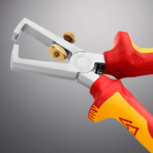 The pliers are set to the conductor cross-section using the knurled screw so that only the insulation is cut into without damaging the conductor. The knurled screw is secured with the inset lock nut to maintain the precise adjustment even during longer periods of work. This simple technology has been tried and tested by electricians for decades.