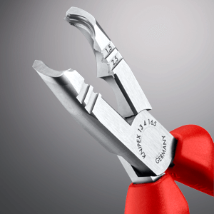 After dismantling, when the core insulation is protected behind the cable sheath cutter by the safety shoulder, the ends of the cable can be stripped with the pliers. Two accurately machined wire stripping holes for conductors with 1.5 and 2.5 mm² enable work to continue without a change of tools. Even the cutting of cable and single conductors before or after dismantling and stripping is possible using the Knipex 13 42 165 dismantling pliers: thanks to the integrated diagonal cutters.