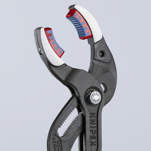 The siphon and connector pliers from Knipex are suitable for a range of applications requiring large grip widths and gentle changes of grip that will not damage components. When odour traps need to be opened on kitchen and bathroom fittings, they can be gripped and twisted powerfully in a measured way using the siphon and connector pliers from Knipex. The pliers can unscrew and tighten screw joints on plastic pipes and sensitive connectors, and are also suitable for detaching hoses that have become stuck to supports – e.g. coolant hoses.