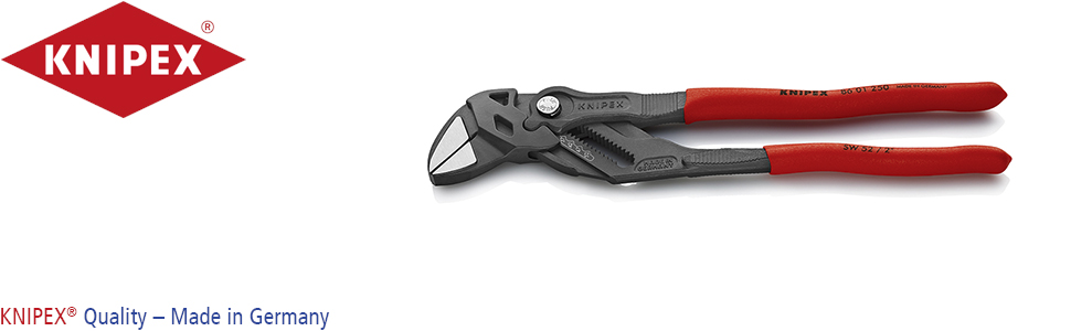 ![]() | Pliers and wrench in a single tool The Knipex pliers wrench 86 01 250 – for classic applications such as plumbing The pliers wrench combines many functions: It replaces an entire set of wrenches in metric and imperial sizes, can be adjusted very quickly and directly on the workpiece at the touch of a button, as well as handling all gripping widths up to 52 mm or 2 inches thanks to infinite adjustment. The joint pin engages securely, preventing unintentional shifting. The smooth gripping jaws are parallel to each other and grip the workpiece without damaging edges or sensitive surfaces – work directly on chrome! |