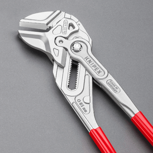 ![]() | Pliers and spanner in a single tool The Knipex 86 03 400 XL pliers wrench – extremely powerful, for large components The XL pliers wrench XL with a length of 400 mm is a versatile tool and combines various useful functions. It replaces a whole set of spanners, for example, and large open-end wrenches with its large grip width – metric (up to 85 mm) and imperial (up to 3 3/8 inches). It therefore saves a lot of money, particularly when used frequently on large pipe and hose screw connections, and reduces the weight to be transported. At the same time, it is still so compact that it fits in a tool bag. It can be adjusted very quickly directly on the component at the touch of a button. The hinge bolt then locks into place securely, preventing inadvertent adjustment. When under tension, the smooth gripping jaws are parallel to each other in every position, and hold the component accurately and with zero backlash, without damaging edges and sensitive surfaces such as chromeor brass – important, for example, for plumbing and heating installation. |