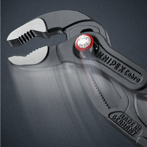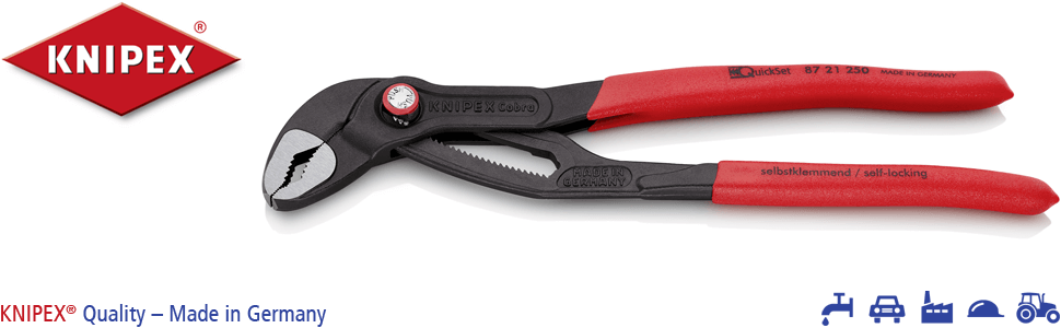 ![]() | The high-tech water pump pliers with fast adjustment Adjust directly on the component using slide function The benefits of working with the Knipex Cobra are plain to see: these water pump pliers are light and stable, thanks to the unique QuickSet technology can be adjusted as quick as a flash on the component and are self-locking on pipes and nuts. The QuickSet function supplements all proven properties of the Knipex Cobra, adding a slide function for easier working in very confined and inaccessible places. |