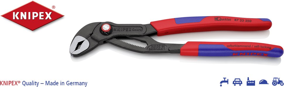![]() | High-tech water pump pliers with fast adjustment and multi-component handle Adjust directly on the component using slide function The benefits of working with the Knipex Cobra are plain to see: these water pump pliers are light and stable, thanks to the unique QuickSet technology can be adjusted as quick as a flash on the component and are self-locking on pipes and nuts. The QuickSet function supplements all proven properties of the Knipex Cobra, adding a slide function for easier working in very confined and inaccessible places. |
