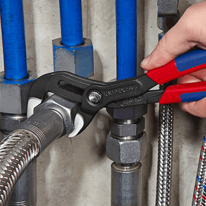 For pipes, nuts, sleeves, for various kinds of components: slide the Knipex Cobra QuickSet open completely, place the upper jaw on the component and push the lower handle of the pliers up the component. The spring-loaded hinge bolt locks securely into place and can only be moved again by pressing the QuickSet button. Thanks to the 25-fold fine adjustment, the Cobra QuickSet can be ideally adjusted to different sizes of the component. This fine adjustment also makes sure that the distance to the handles remains hand-friendly for every opening width.