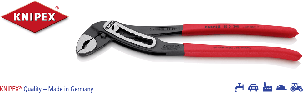 The Knipex Alligator with its box joint design and double guide offers very high stability for professional use. The teeth on the gripping surfaces have been induction hardened to approx. 61 HRC. This guarantees a very long tool life with an ever “biting” hold on the component. The Knipex Alligator is sturdily built, easy to clean and thus an ideal tool for working outdoors. The pliers are black and phosphate-treated. The head of the pliers has a precision finish. The handles of the pliers are coated with non-slip plastic.