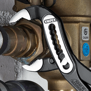 Work in the plumbing and heating area is often conducted in confined spaces. The arched adjustment slot and the slim head shape of the Knipex Alligator are an advantage here. As compact as these pliers are, the possible grip widths are surprisingly large due to the 9-step locking adjustment: pipes up to 70 mm (2 3⁄4 inches) and nuts up to 60 mm, which is 30 % more than with standard water pump pliers of the same size.