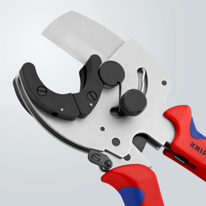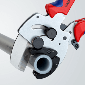 ![]() | Pipe cutter for cutting thick-walled plastic and composite pipes with a diameter Right-angled cut thanks to exact positioning and holding in place When inserting a plastic or composite pipe, it is automatically positioned precisely at a 90° angle to the blade. The moving contact jaws centre and reliably hold the pipe. The cut through the pipe therefore takes place automatically at right angles to the pipe. The Knipex 90 25 40 model has only been designed for thick-walled pipes. The Knipex range has models 90 20 185 and 94 10 185 for thin-walled plastic pipes. |