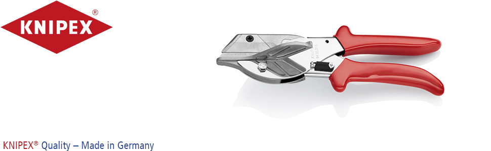 ![]() | Knipex 94 35 215 mitre shears for plastic and rubber sections Mitre soft profiles perfectly With the Knipex 94 35 215 mitre shears you can cut soft profiles to size and create corner joints that look as if they were made by a machine. Blade support with stop and angle markings, opening spring and catch, tool body made of special tool steel, rolled and oil hardened, made in Knipex quality: These properties ensure crush-free mitre cuts. |