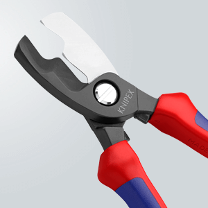 Unlike diagonal cutters with blades that meet at an obtuse angle and which crush cable insulation, the Knipex 95 12 200 cable shears cut with the twin cutting edge using a scissors action. They are therefore excellent for shortening stranded and finely stranded Cu and Al cables, also with large cross-sections. For reasons of design, the cable shears must not be used to cut steel wire or hard drawn copper conductors.