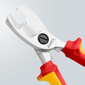 Unlike diagonal cutters with blades that meet at an obtuse angle, and which crush cable insulation and deform cable ends, the Knipex 95 16 200 cable shears cut with the twin cutting edge using a scissors action. This principle produces a substantially better result, because the cable is not crushed, but is cut very smoothly and cleanly. They are therefore excellent for shortening stranded and finely stranded Cu and Al cables, also with large cross-sections. For reasons of design, the cable shears must not be used to cut steel wire or hard drawn copper conductors.