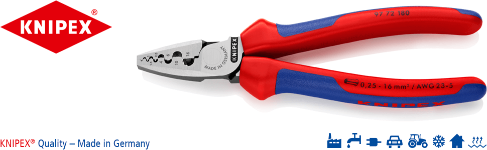 ![]() | Crimping pliers from Knipex: good quality for maximum durability. Crimping pliers for end sleeves (ferrules) from the Knipex range are impressive by virtue of their smooth operation and perfect transmission ratio. Crimping is easy. Knipex crimping pliers are manufactured on modern machinery using special tool steel and are then oil-hardened. The safe use and great benefits of the tools are the results of decades of toolmaking experience, constant product development and the commitment by Knipex towards high quality standards. |